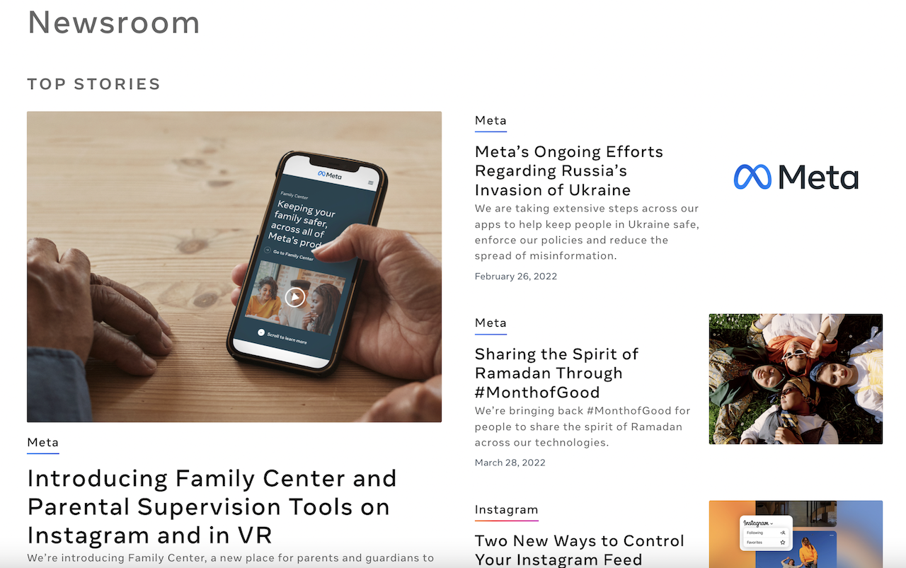Have you heard of Facebook’s Newsroom? It’s a dedicated place on Facebook where you can access the latest news, announcements, and media resources. Stay up to date on the latest and greatest with endless content to read and learn from. Explore different categories like Facebook, Instagram, Messenger, WhatsApp, and much more. Even sift through topics such as “Company News” or “Technology and Innovation”.