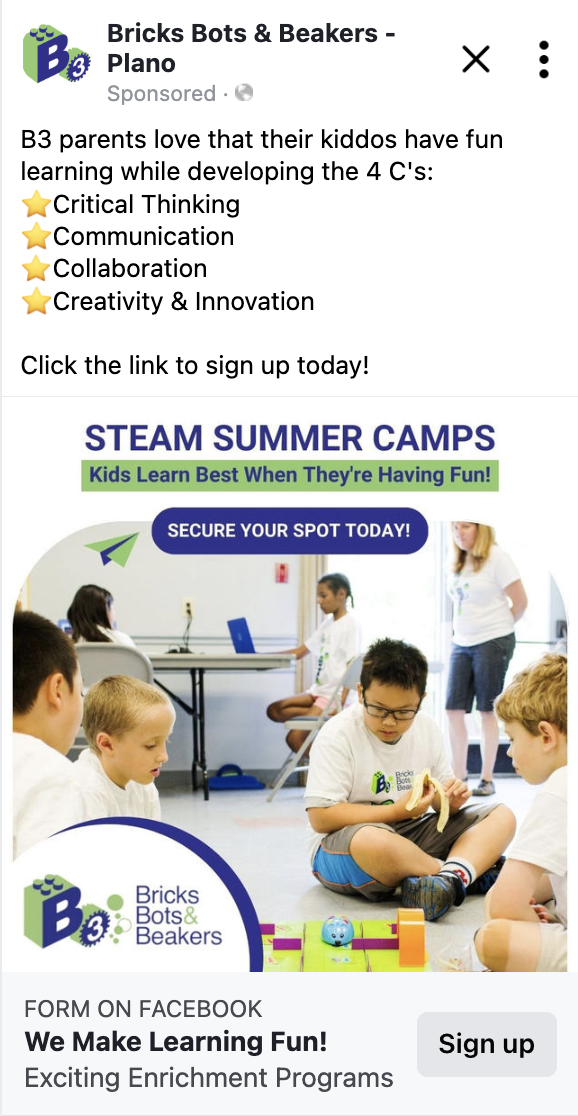 B3’s client prospecting lead generation ad campaigns aimed to drive new business by highlighting their summer camps and urging parents to register their children before spots filled up.