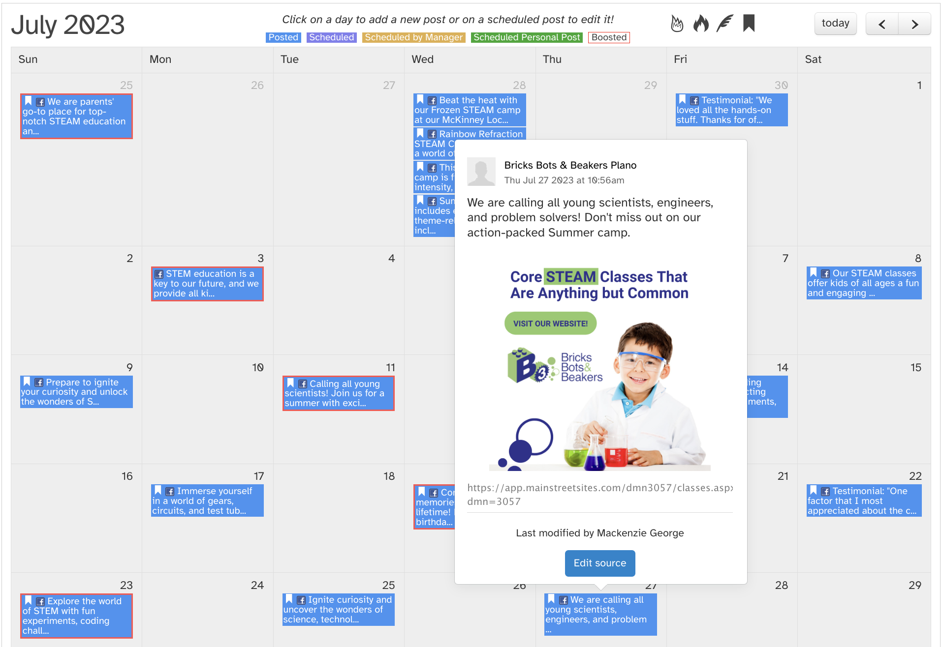 Schedule and publish posts to each location’s Facebook and Instagram pages.