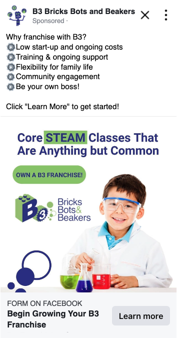 B3’s franchise development lead generation ad campaigns aimed at recruiting qualified franchise owners by highlighting the benefits of owning a B3 franchise, including low start-up costs and flexibility.